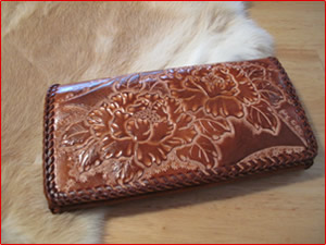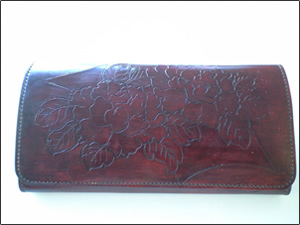 素材:ヌメ 鎌倉彫風染め 図案:ボタンをスイーベルナイフのカットのみで |